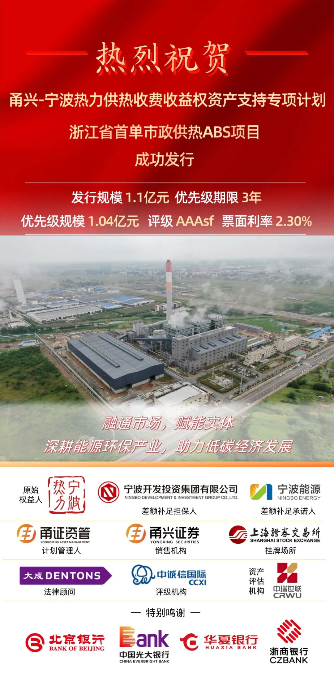 9月25日,由宁波能源(600982)子公司宁波热力作为原始权益人,宁波能源作为差额补足承诺人,宁波开投集团作为差额补足担保人的甬兴—宁波热力供热收费收益权资产支持专项计划(简称“本项目”)成功发行。本项目为浙江省首单市政供热收费收益权资产支持专项计划,由甬兴证券作为牵头人和销售机构,甬证资管作为计划管理人51我要配资,发行规模1.1亿元,其中优先级发行规模1.04亿元,发行期限3年,票面利率2.3%;次级发行规模0.06亿元。