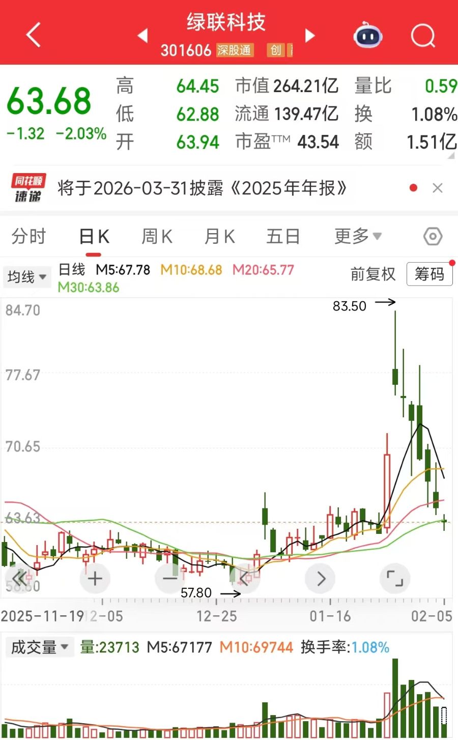 截至2026年2月5日午间收盘,绿联科技报收63.68元/股,跌幅2.03%,总市值264.21亿元。相较六个交易日前的最高股价83.5元/股,该股近期累计跌幅超23%,市值蒸发超80亿元。